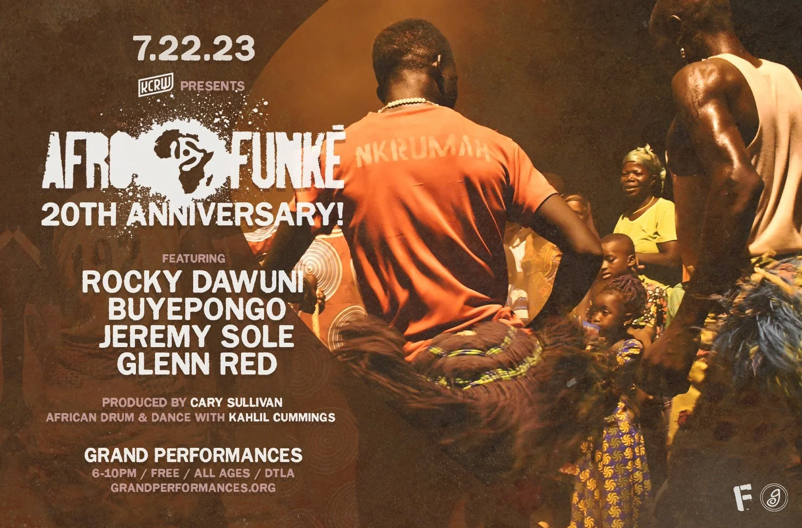 Please come out and celebrate the legacy of the once weekly party night that turned global, with live performances from Rocky Dawuni and Buyepongo, plus DJ sets from Afro Funke’ resident DJs Glenn Red, and Jeremy Sole (resident KCRW DJ too!) and live drumming and dancing by the amazing Kahlil Cummings & friends! Join us for Afrobeat, Latin, Brazilian, Indian, Jamaican and other traditional and remixed world rhythms, plus African drumming and dancing, DJ Culture, arts & crafts, merch and much more!